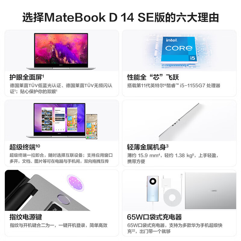 详细参数 品牌:华为(HUAWEI) 系列:HUAWEI MateBook D 型号:NbDE-WFH9 产品定位:家庭办公,学生用机,影音娱乐,轻薄便携,性价比机 操作系统:Windows 11 CPU平台:Intel CPU型号:第11代智能英特尔® 酷睿™ i5-1155G7 处理器 CPU主频:基频2.5GHz,最高频率4.5GHz 内存容量:16GB 内存类型:LPDDR4x 插槽数量:板载内存 最大支持内存:16GB 硬盘容量:512GB 硬盘类型:固态硬盘 显卡类型:核芯显卡 显存容量:共享系统内存 显卡型号:英特尔锐炬Xe 光驱类型:无光驱 屏幕尺寸:14英寸 屏幕类型:IPS 屏幕比例:16:9 屏幕分辨率:1920×1080 触摸功能:不支持 摄像头:支持 触控:非触控 蓝牙功能:蓝牙5.1 局域网:无 无线局域网:Wi-Fi 6 USB2.0端口:1个 视频端口:HDMI 音频端口:耳机/麦克风二合一接口 USB3.2端口:1个 USB3.1端口:无 USB3.0端口:0个 电池:锂聚合物电池 电源适配器:65W USB-C电源适配器(标配) 续航时间:9小时以上 颜色:皓月银 厚度:15.9 机身尺寸:322.5毫米×214.8毫米×15.9毫米 净重:1.38千克 厂商保修政策:2年质保 选购热点:超薄机身 CCC认证编号:2021010902413271 生产者(制造商)名称:华为终端有限公司