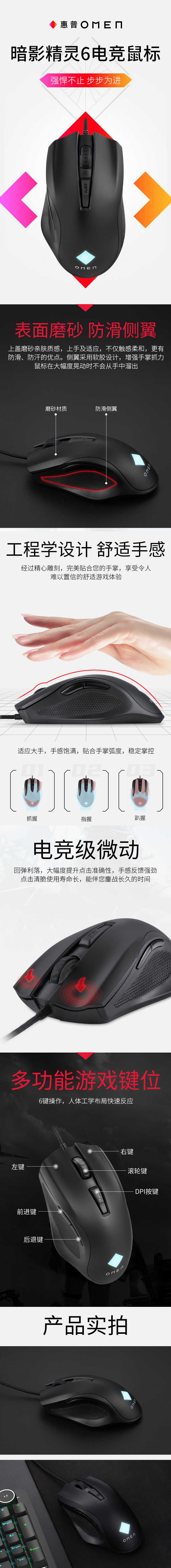 主体 品牌惠普(hp) 鼠标产品类型光电鼠标,办公鼠标,吃鸡鼠标 产品型号暗影精灵6 OMEN电竞游戏鼠标 材质塑料 颜色黑色 适用类型竞技游戏,办公,笔记本便携 功能 供电模式USB供电 鼠标接口USB 工作方式光电 人体工学是 按键数6 鼠标连接方式有线 无线鼠标否 线长1.8米 适用系统Windows 8,Windows 7,Windows10及以上,Linux 规格 鼠标产品尺寸100mm-120mm 净重量121克