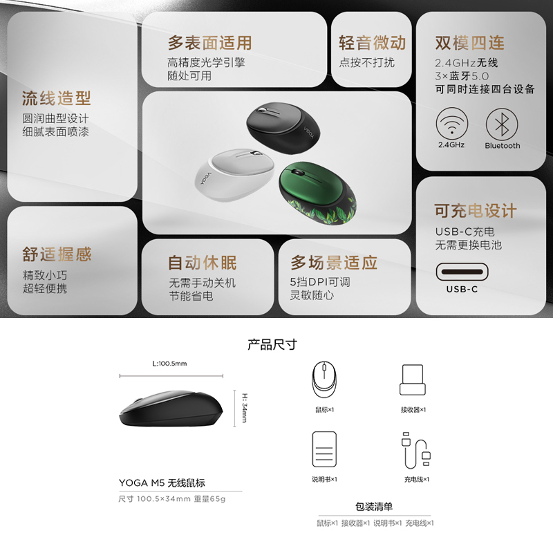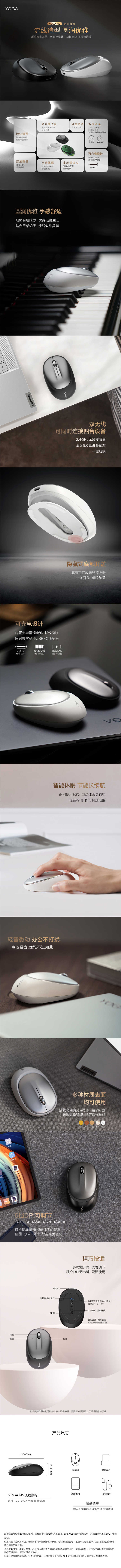 主体 品牌联想(Lenovo) 鼠标产品类型双模,人体工学鼠标,充电鼠标,蓝牙鼠标,办公鼠标 产品型号YOGA M5 无线鼠标 暗夜 颜色灰黑色 适用类型办公,笔记本便携 上市时间(月)2023-02 功能 供电模式充电 鼠标接口蓝牙 工作方式蓝牙 人体工学是 按键数5 鼠标连接方式蓝牙 无线鼠标是 规格 鼠标产品尺寸100mm-120mm 净重量65克