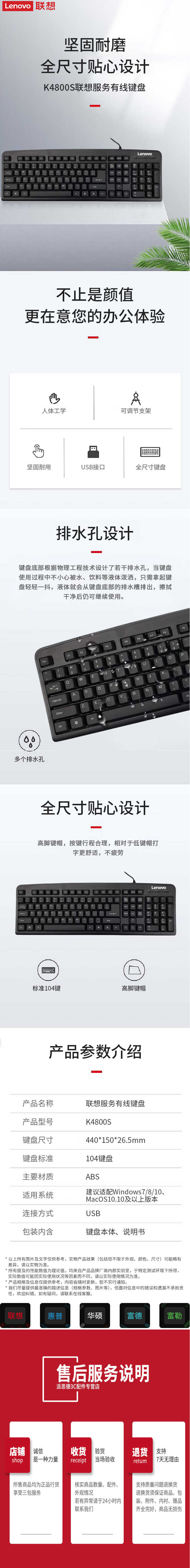 主体 品牌联想(Lenovo) 键盘类型有线键盘 型号K4800S 材质ABS 颜色黑色 连接类型有线 适用类型经济实用,时尚个性,办公 上市时间(月)2020-01 规格 键盘接口USB 多媒体功能键无 按键寿命5000000次 按键技术火山口架构 背光灯不支持 键盘按键数104 尺寸(长×宽×高)440x150x26.5毫米 重量0.7千克 是否有数字键盘有 轴体品牌其他轴 产品特色 产品特色防水设计