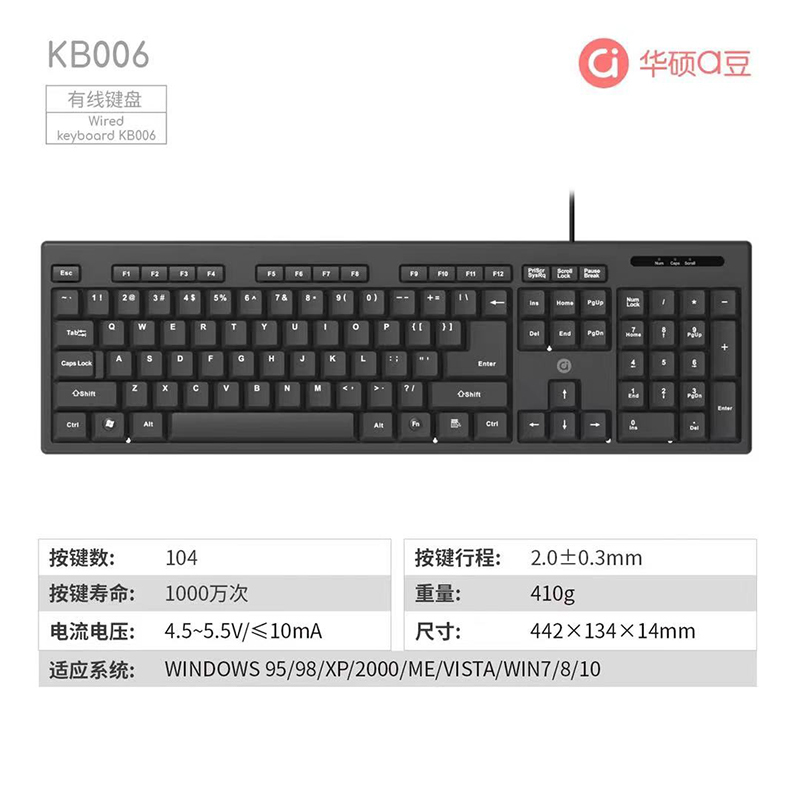主体 品牌华硕(ASUS) 键盘类型办公键盘 型号KB006 颜色黑色 连接类型有线 适用类型经济实用 规格 键盘接口USB 多媒体功能键否 按键寿命90000000次 按键技术宫柱架构 背光灯不支持 键盘按键数104 重量0.1千克 是否有数字键盘有 轴体品牌其他轴