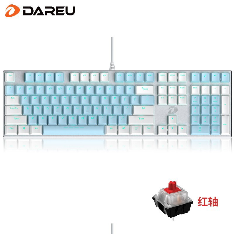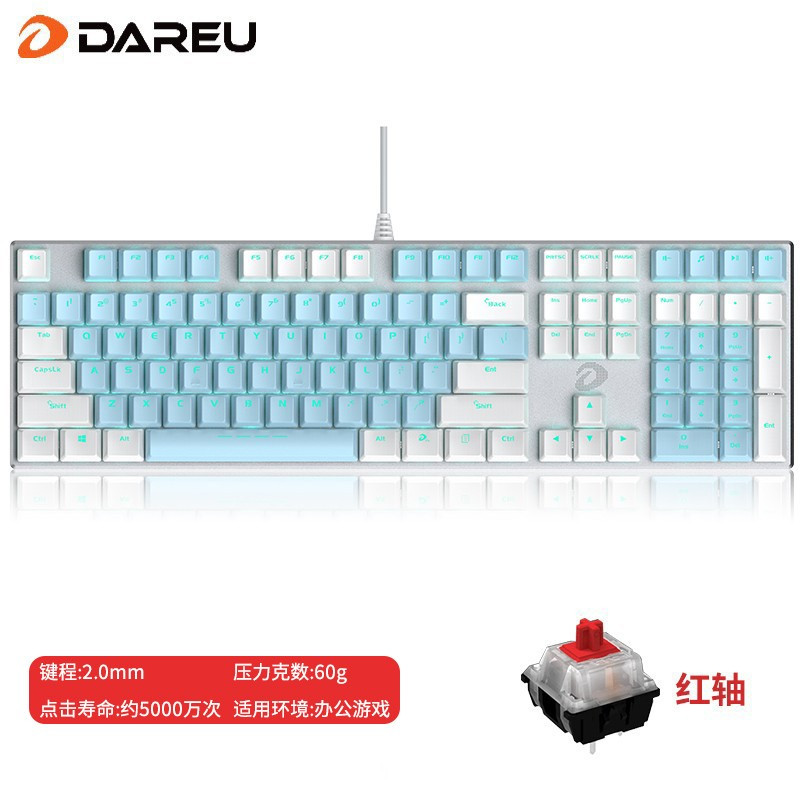 主体 品牌达尔优(DARE-U) 键盘类型机械键盘 型号108键蓝白色【红轴】 颜色蓝色 连接类型有线 适用类型经济实用,时尚个性,办公,竞技游戏 规格 键盘接口USB 多媒体功能键有 按键寿命50000000次 按键技术红轴 背光灯支持 键盘按键数108 重量1.3千克 是否有数字键盘有 纠错 轴体品牌凯华轴